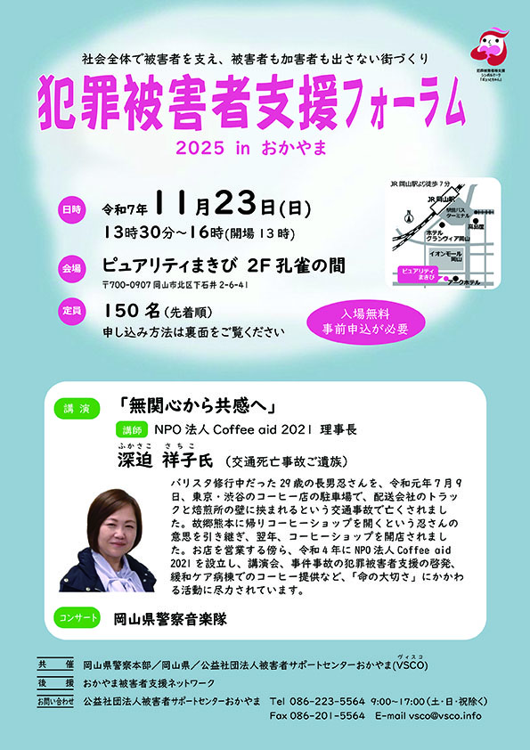 10月4日(土) 11月23日(日) 岡山市のピュアリティまきびで 岡山県警察本部・岡山県と共催で 犯罪被害者支援フォーラム 2025 in おかやま を開催します。 入場は無料ですが、事前申し込みが必要です。 詳しくは ![]() |